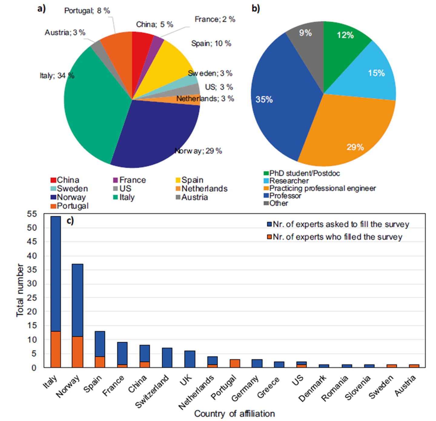 Experts responding to the survet: a) country of affiliation of responding experts; b) professional qualification; c) number of responding vs. invited experts by country of affiliation.