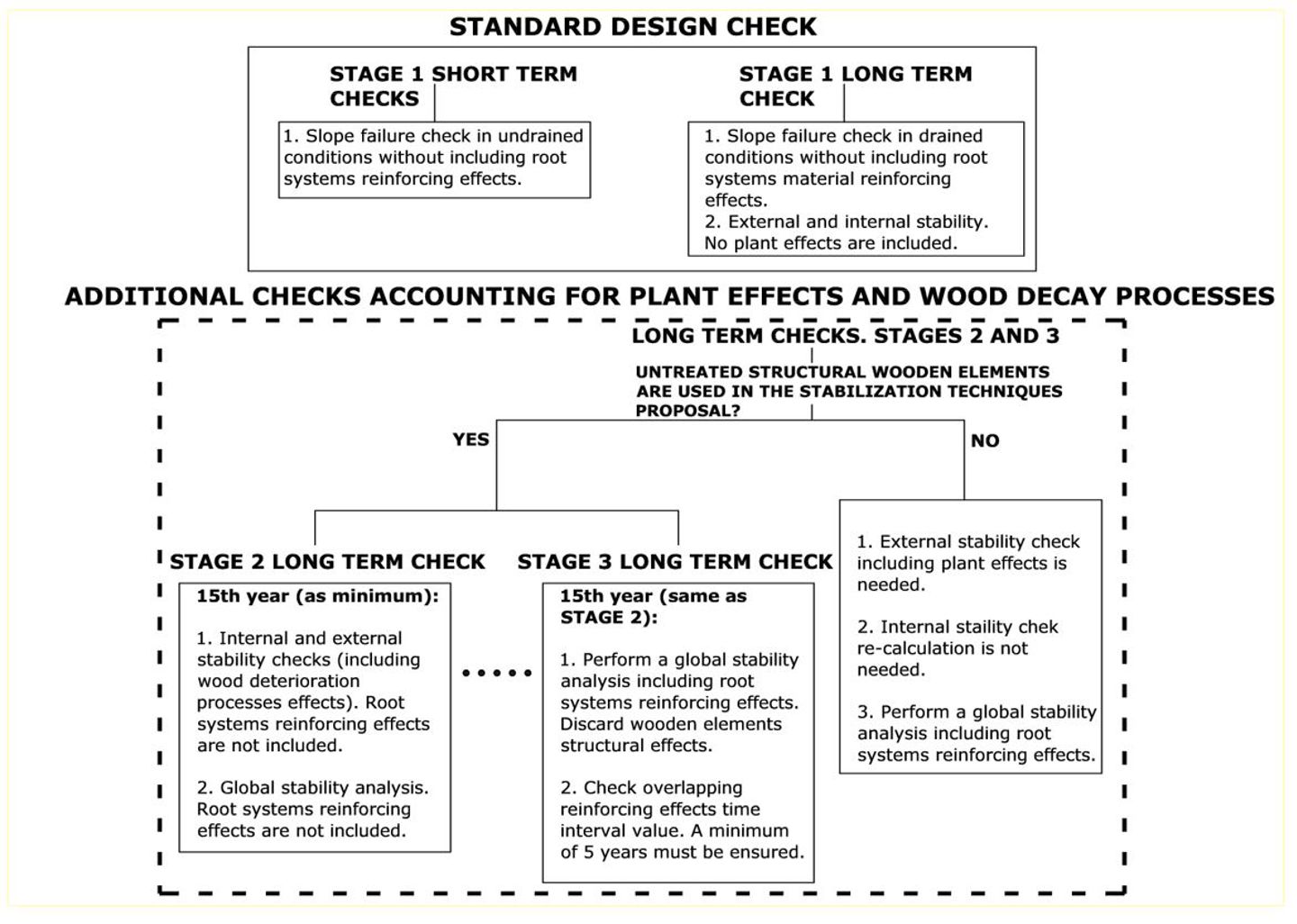 With a stress transfer approach between the utilized inert element and the evolving vegetation, a set of design time milestones are integrated throughout the soil bioengineering service life stability checks.