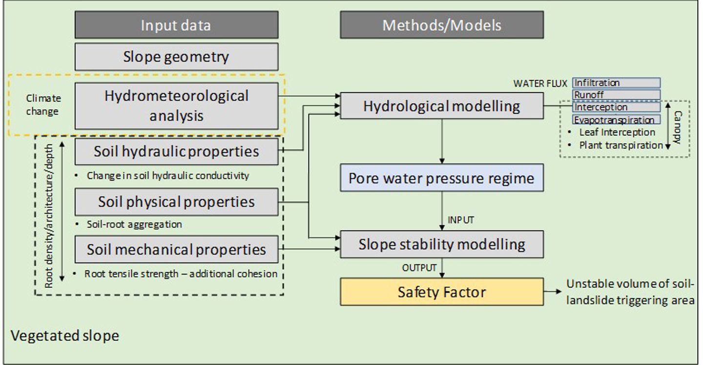 In the methodological approach, all the effects of vegetation to the change of soil parameters or the main hydrological processes are identified and categorized, based on whether they are a function of the root features (mostly density, architecture and depth) or the canopy (type of aboveground vegetation). The methodology was used for two main cases: (1) considering only the mechanical contribution of vegetation and (2) considering both the hydrological and mechanical reinforcement of vegetation.